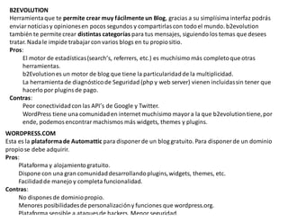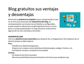 El documento analiza las ventajas y desventajas de usar blogs gratuitos alojados en plataformas como WordPress.com en comparación con usar WordPress de forma autogestionada. WordPress.com ofrece alojamiento y plataforma gratuitos pero no permite dominios personalizados ni tanta flexibilidad de configuración. Aunque es sencillo de usar y tiene una gran comunidad, es más vulnerable a hackers. Otras opciones como B2Evolution también ofrecen creación fácil de blogs pero con menos conectividad a APIs y menor comunidad que WordPress.