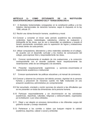 Este documento describe los derechos y compromisos de los estudiantes de acuerdo con el manual de convivencia de una institución educativa. Los estudiantes tienen derecho a recibir una educación de calidad, expresar sus ideas, participar en actividades extracurriculares, y ser tratados con dignidad. A cambio, los estudiantes se comprometen a asistir a clases, cumplir con las tareas, respetar a los demás, y cuidar las instalaciones de la institución. El documento enfatiza que los derechos conllevan de