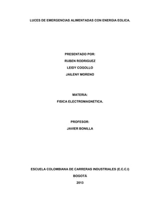 El documento presenta un proyecto de luces de emergencia alimentadas con energía eólica realizado por estudiantes de la Escuela Colombiana de Carreras Industriales. El proyecto busca transformar la energía eólica en energía eléctrica para implementar un sistema de iluminación de emergencia en industrias. El documento incluye la introducción del proyecto, los objetivos, antecedentes sobre el crecimiento mundial de la energía eólica, y el marco teórico sobre cómo se obtiene y aprovecha la energía e
