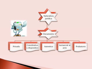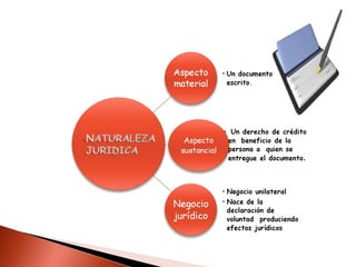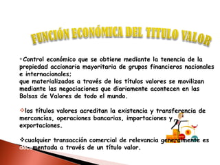 Los títulos valores son documentos que representan derechos u obligaciones económicas entre el emisor y tenedor. Son creados por particulares sin intervención de funcionarios públicos, pero pueden adquirir validez pública si son presentados ante notario. Los títulos valores deben cumplir con requisitos formales establecidos por ley para que los derechos incorporados en ellos puedan ser ejercidos.