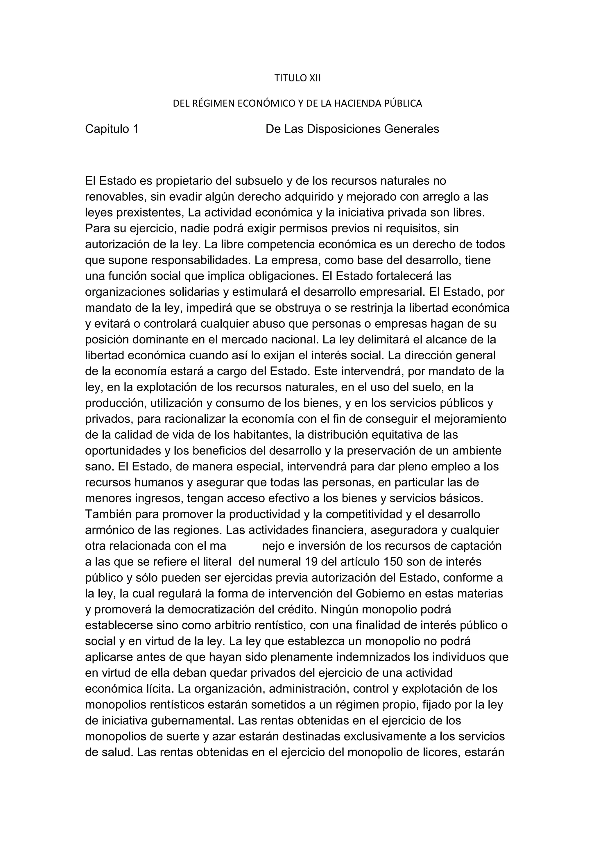 Este documento presenta un resumen de 3 oraciones o menos del Capítulo 1 del Título XII de la Constitución Política de Colombia sobre el régimen económico y la hacienda pública. Establece que el Estado es propietario de los recursos naturales y dirige la economía para mejorar la calidad de vida de los habitantes a través de una economía racionalizada e intervención en áreas como la explotación de recursos y la producción. También busca promover la productividad, competitividad y desarrollo regional de manera armónica.