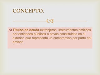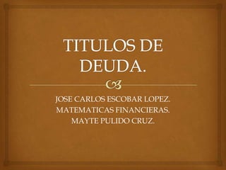 Este documento describe diferentes tipos de títulos de deuda que pueden emitir entidades públicas y privadas, incluyendo bonos cero cupón, bonos con descuento, bonos de deuda interna y externa, y papel comercial. Explica que las empresas y gobiernos emiten títulos de deuda para obtener financiamiento luego de cumplir con un proceso de autorización. Los títulos establecen el pago de intereses y la devolución del monto invertido en una fecha acordada, convirtiendo al inversionista en acre
