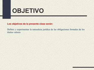 El documento define los objetivos de la clase sobre títulos valores, que son definir y experimentar la naturaleza jurídica de las obligaciones formales de los títulos valores. Luego explica que los títulos valores son documentos que promueven la actividad económica agilizando el tráfico patrimonial y que incorporan una promesa unilateral de efectuar una prestación por parte del deudor. Finalmente, introduce los principios cambiarios como la incorporación, literalidad, formalidad, circulación, autonomía, legitimación y abstracción que rigen