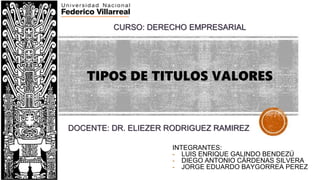 Este documento presenta un resumen de 3 oraciones o menos sobre los títulos valores. Detalla los integrantes del grupo, el curso y docente. Explica los tipos de títulos valores reconocidos por la ley peruana, sus requisitos, funciones económicas y principios. Finalmente, describe instrumentos como letras de cambio, pagarés y cómo se transfieren.