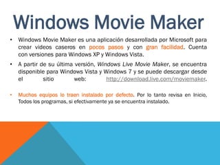 Este documento proporciona una guía para el uso del programa Windows Movie Maker. Explica cómo instalar el programa, importar videos, fotos y audio, aplicar transiciones y efectos, y generar un video final. Se destacan los pasos básicos de ingresar al programa, agregar contenidos multimedia, incorporar música, aplicar transiciones entre imágenes, añadir efectos visuales, y exportar el video completo.
