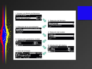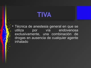 El documento describe la técnica de anestesia total intravenosa (TIVA), la cual utiliza solo fármacos intravenosos para la inducción y el mantenimiento anestésico sin usar agentes inhalatorios. La TIVA ofrece ventajas como inducción suave, menos nauseas y vómitos, y recuperación más rápida; pero también tiene desventajas como la necesidad de acceso intravenoso y mayores costos con algunos fármacos. La historia de la TIVA comenzó en los 1800s y ha evolucionado gracias a nuevos fá