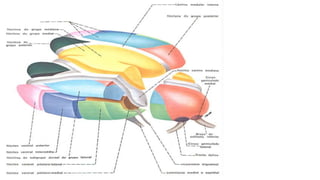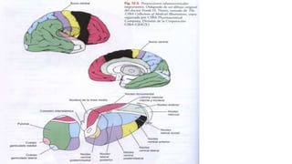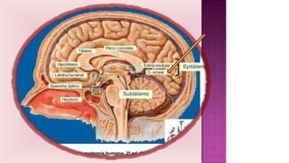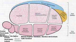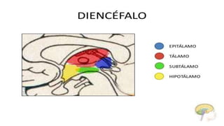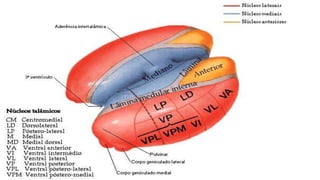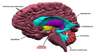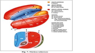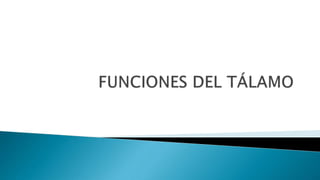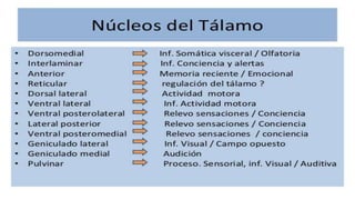 El tálamo es una región del diencéfalo que se divide en varios núcleos y zonas. Tiene la función principal de transmitir información sensorial y motora entre la corteza cerebral y el resto del cuerpo. Se divide en núcleos específicos, de asociación e inespecíficos, cada uno con conexiones y funciones diferentes. Lesiones del tálamo pueden causar síndromes sensoriales y motores. La enfermedad de Huntington es una enfermedad genética que causa degeneración neuronal progresiva en el tá