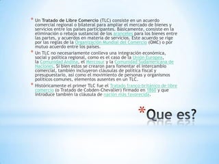 Un Tratado de Libre Comercio (TLC) es un acuerdo comercial bilateral o regional que busca ampliar el mercado de bienes y servicios entre países participantes mediante la eliminación o reducción de aranceles y acuerdos sobre servicios. A diferencia de uniones económicas como la Unión Europea, un TLC no necesariamente incluye integración política o social. El primer TLC fue el Tratado franco-británico de 1860.