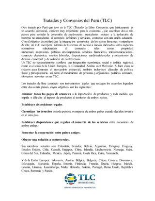 El documento describe los tratados de libre comercio (TLC) que Perú ha firmado con otros países. Un TLC es un acuerdo comercial que reduce aranceles y barreras no arancelarias para promover el comercio de bienes y servicios. Además de facilitar el acceso a mercados, un TLC también incluye disposiciones sobre propiedad intelectual, inversiones, competencia, telecomunicaciones y otros temas relacionados con el comercio. Los objetivos de un TLC incluyen eliminar aranceles, establecer leyes comerciales, proteger