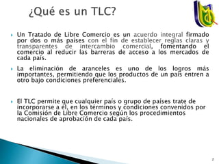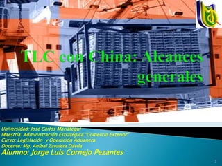 El documento describe los principales aspectos de un posible Tratado de Libre Comercio (TLC) entre Perú y China. Explica que un TLC establecería reglas claras para promover el comercio entre los países mediante la reducción de aranceles. Luego resume los posibles capítulos de negociación como acceso a mercados, reglas de origen, defensa comercial, y cooperación aduanera. Finalmente, señala que un TLC podría aumentar las exportaciones peruanas a China y establecer un marco para las relaciones económicas