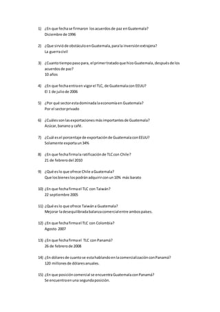 Los acuerdos de paz en Guatemala se firmaron en diciembre de 1996, poniendo fin a una guerra civil que había obstaculizado la inversión extranjera. Diez años después, Guatemala firmó su primer tratado comercial con Estados Unidos, el cual entró en vigor el 1 de julio de 2006. Desde entonces, Guatemala ha firmado tratados de libre comercio con varios países, incluyendo Chile en 2010, Taiwán en 2005, Colombia en 2007 y Panamá en 2008, con el objetivo de mejorar el equilibrio comercial y aumentar el com