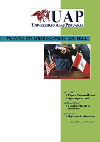 El documento presenta una introducción al Tratado de Libre Comercio (TLC) entre Perú y Estados Unidos. Explica que un TLC busca eliminar barreras arancelarias y para arancelarias para facilitar el comercio. Luego, describe los objetivos del TLC con Estados Unidos, como garantizar acceso permanente a ese mercado, incrementar exportaciones, atraer inversión, y mejorar bienestar. Finalmente, destaca algunos beneficios para consumidores peruanos de contar con un TLC, como acceso a más productos de mejor calidad y