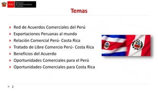 El documento resume la relación comercial entre Perú y Costa Rica, incluyendo una descripción de la red de acuerdos comerciales de Perú, las exportaciones peruanas a Costa Rica y las oportunidades que brinda el Tratado de Libre Comercio firmado entre los dos países en 2011. El TLC promueve el comercio bilateral al otorgar mejores condiciones de acceso a los mercados y reglas claras, lo que generará oportunidades para productos peruanos como alimentos frescos, manufacturas y productos costarricenses como alimentos procesados y