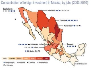 Este documento analiza los efectos del TLCAN en México desde una perspectiva macroeconómica y social. Aunque el TLCAN trajo estabilidad macroeconómica e incrementó las exportaciones, la inversión extranjera no logró generar progreso social y mantuvo una estructura económica basada en bajos costos. El sector agrícola mexicano sufrió competencia desleal y perdió seguridad alimentaria. Además, el TLCAN benefició más los intereses estadounidenses que el desar
