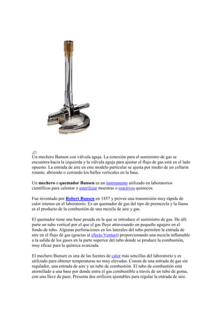 Este documento describe el mechero Bunsen, un instrumento comúnmente utilizado en laboratorios de química. Explica que el mechero Bunsen proporciona una transmisión rápida de calor mediante la combustión de una mezcla de aire y gas. Detalla las partes que lo componen y cómo se puede ajustar la llama variando el flujo de aire y gas. Además, distingue entre diferentes tipos de llama según la temperatura y el color.