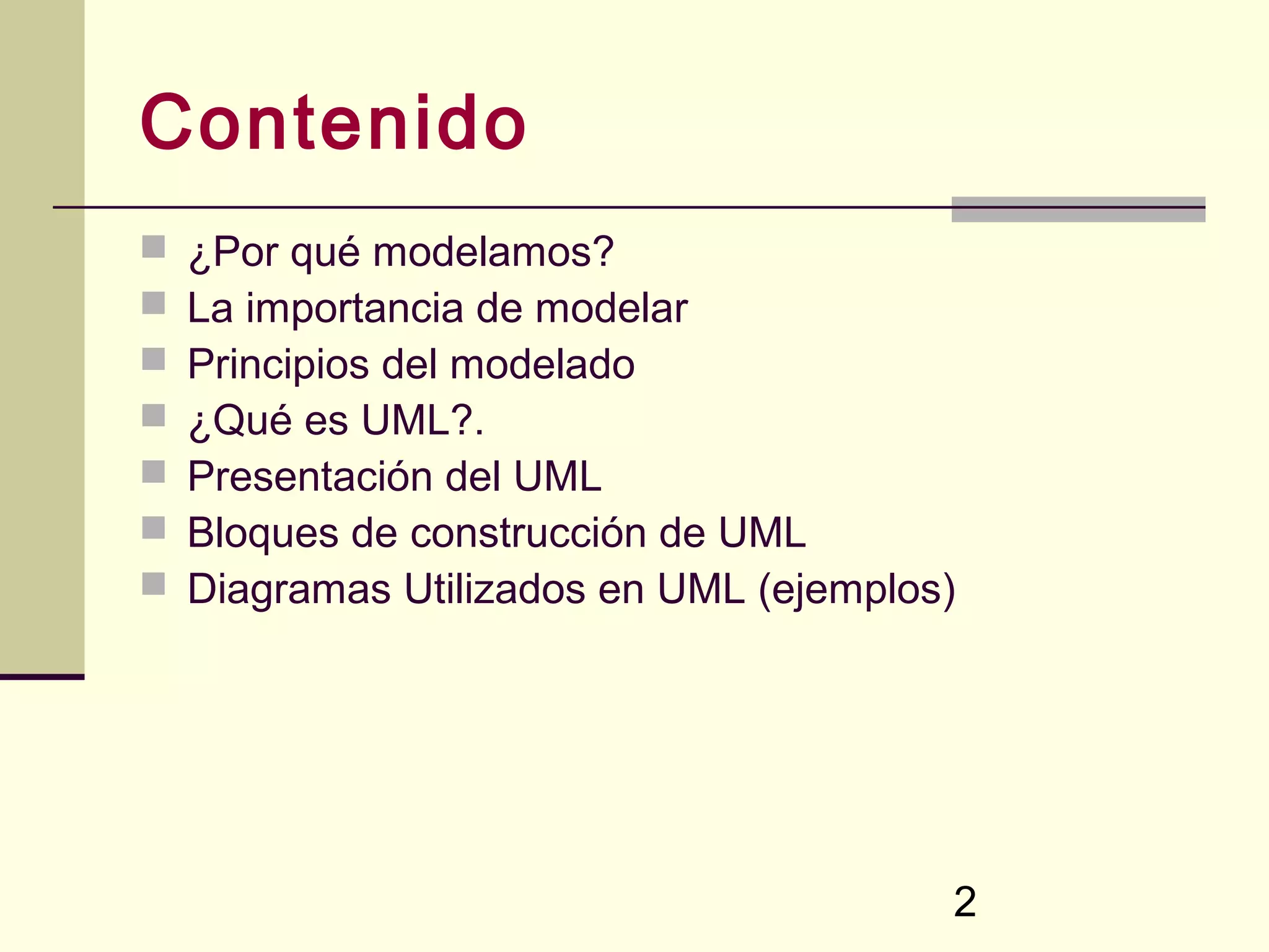 Este documento introduce el lenguaje de modelado unificado (UML). Explica que UML permite especificar, construir, visualizar y documentar los artefactos de un sistema de software orientado a objetos a través de una notación gráfica. También describe los principales elementos de UML como clases, casos de uso, diagramas y bloques de construcción que permiten modelar tanto la estructura estática como el comportamiento dinámico de un sistema.