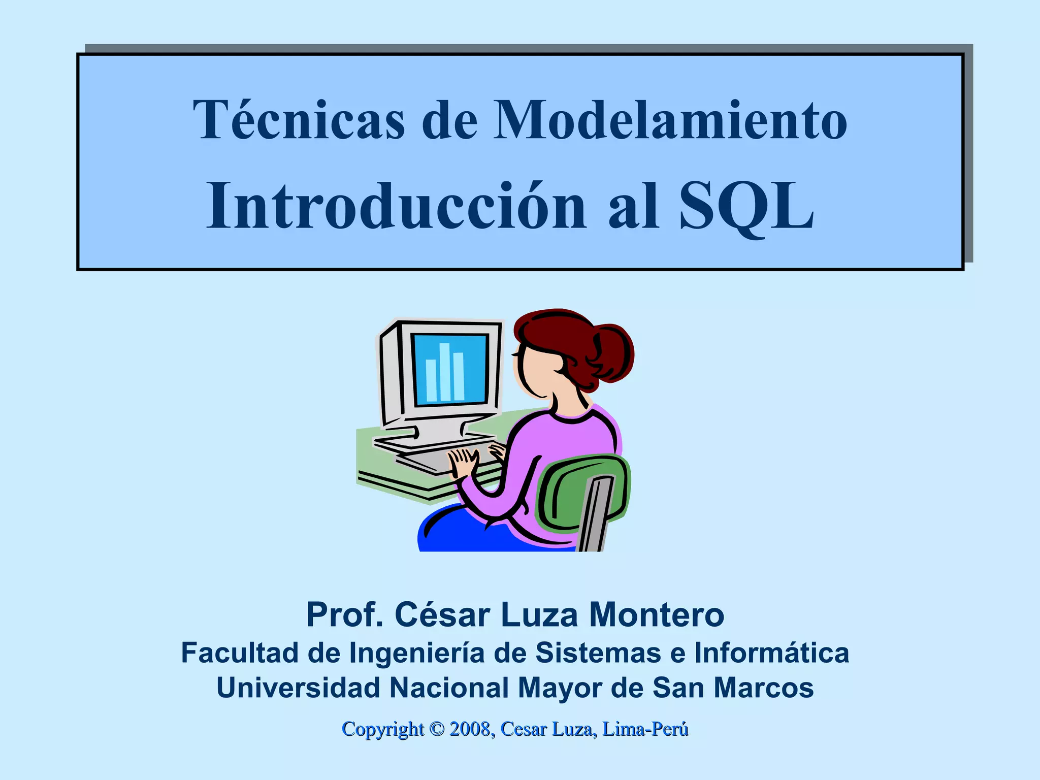 Este documento introduce conceptos básicos de SQL como la creación de tablas, tipos de datos, claves primarias y foráneas. Explica los diferentes tipos de lenguajes SQL (DDL, DML, DCL) y sus comandos principales como CREATE, ALTER, DROP, INSERT, UPDATE y DELETE. Finalmente, proporciona detalles sobre cómo realizar consultas SELECT en una base de datos relacional.