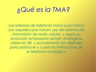 Este documento describe los sistemas de telefonía móvil automática (TMA), incluyendo sus inicios analógicos y su evolución hacia sistemas digitales. Explica conceptos clave como las células, el handover y el roaming. También describe las diferentes generaciones de tecnologías móviles como GSM, GPRS, UMTS, HSPA y LTE, así como sistemas de navegación vía satélite como GPS, Galileo e Iridium.