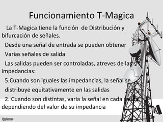 El documento describe el funcionamiento de un circuito de simulación de una T-Magica, un dispositivo que distribuye y bifurca señales de entrada en varias salidas. Cuando las impedancias de salida son iguales, la señal se distribuye equitativamente; cuando son desiguales, la señal varía en cada salida dependiendo de su impedancia. El circuito simulado interconecta dos T-Magicas para obtener cuatro salidas, mostrando cómo la señal se distribuye igual cuando las impedancias coinciden, y de forma desigual cuando