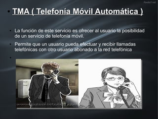 El documento describe los conceptos fundamentales de la telefonía móvil, incluyendo la Telefonía Móvil Automática (TMA), elementos del servicio TMA como estaciones base y centrales de conmutación, zonas de cobertura, estaciones móviles, y sistemas celulares. También discute tecnologías como GSM, Iridium, GPS, Galileo, handover, y roaming. Explica otros servicios como LTE, LMDS, HSPA+, y DECT. Finalmente, analiza dispositivos como smartphones, Apple, netbooks, iPad, y BlackBerry.