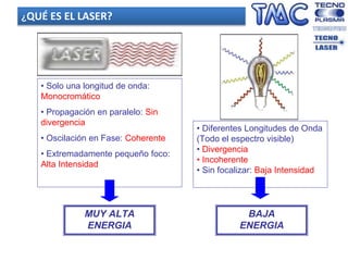 El documento describe el proceso de cladding láser, que utiliza un láser de alta potencia para fundir un polvo de material sobre una pieza para crear recubrimientos de alta calidad. Se enfoque en la interacción entre los parámetros del láser, como la potencia, la velocidad y el caudal másico, que afectan la geometría y calidad del cordón obtenido. Además, se analizan diversas aplicaciones de materiales, sus propiedades y una serie de ensayos para evaluar la resistencia a la corrosión y la adherencia del recubrimiento.