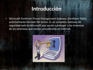 Microsoft Forefront Threat Management Gateway (Forefront TMG), anteriormente conocido como ISA Server, es un gateway de seguridad completo que ayuda a proteger empresas de amenazas de Internet mediante la detección de virus, códigos maliciosos y otras amenazas en páginas web y correo electrónico, el filtrado de URL, la inspección de HTTPS y NIS para vulnerabilidades, y la traducción de direcciones de red. TMG también proporciona actualizaciones de protección y soporte para Windows Server 2008 de 64 bits.