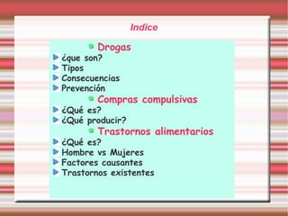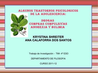 Este documento describe varios trastornos psicológicos comunes en la adolescencia como las drogas, las compras compulsivas, y los trastornos alimenticios. Explica qué son cada uno de estos trastornos, sus causas, y sus efectos. También discute formas de prevenirlos.
