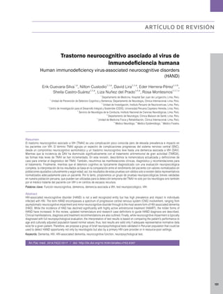 Este documento describe el trastorno neurocognitivo asociado al VIH (TNAV), una complicación frecuente pero poco conocida en pacientes con VIH. El TNAV incluye un espectro de compromisos del sistema nervioso central, desde un deterioro neurocognitivo asintomático hasta una demencia asociada al VIH. Aunque la incidencia de demencia ha disminuido con el tratamiento antirretroviral, las formas leves de TNAV son más comunes. Se propone el uso de pruebas neuropsicológicas breves valid