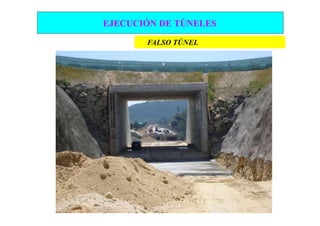 El documento describe los diferentes métodos para la ejecución de túneles, incluyendo el uso de tuneladoras, rozadoras, el método belga y el nuevo método austriaco. Explica las consideraciones generales sobre seguridad y salud, como la legislación aplicable, el diseño de sistemas de acceso y salida, y los materiales apropiados para diferentes tipos de rocas. También describe el ciclo de avance del método austriaco, que implica perforación, carga de explosivos, voladura, desescombro y otros pasos.