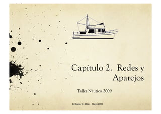 Este documento describe diferentes tipos de redes y aparejos de pesca. Explica que las redes están compuestas de paño, flotadores, lastre y relingas. Luego describe redes de cerco, tiro, arrastre, rastras, izadas y de caída, detallando sus características y usos.