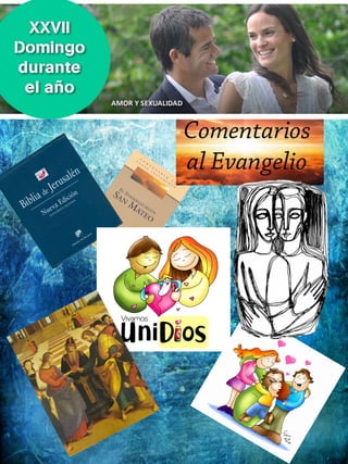 El documento presenta las lecturas para el XXVII Domingo del Tiempo Ordinario. La primera lectura es del Génesis y describe cómo Dios creó a la mujer para el hombre para que no estuviera solo. La segunda lectura es de la Carta a los Hebreos y explica cómo Jesús se hizo hombre para llevar a la salvación a muchos hijos de Dios. El Evangelio según San Marcos presenta a Jesús respondiendo a los fariseos que el matrimonio es lo que Dios ha unido y que el hombre no debe separar.