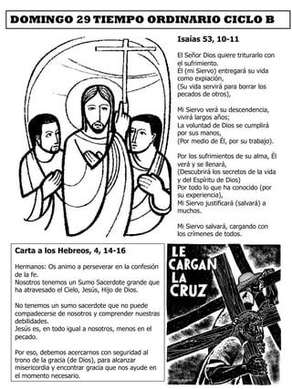 El documento resume las lecturas del XXIX Domingo del Tiempo Ordinario ciclo B. La primera lectura de Isaías habla sobre el Siervo de Dios que sufre y muere para salvar a muchos. La segunda lectura de la Carta a los Hebreos dice que Jesús, nuestro Sumo Sacerdote, comprende nuestras debilidades. El Evangelio de Marcos relata como Santiago y Juan piden sentarse a la derecha de Jesús, pero Él les dice que deben servir a los demás como Él vino a servir y dar su vida