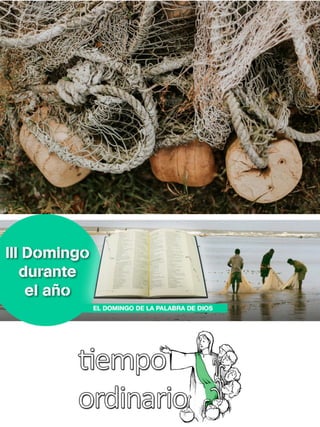 El documento presenta las lecturas para el segundo domingo del tiempo ordinario. La primera lectura describe a Dios ordenándole al profeta Jonás que vaya a Nínive y les advierta sobre su destrucción. Jonás obedece y los habitantes de Nínive se arrepienten. La segunda lectura de Pablo insta a vivir el presente sin apegos mundanos. El evangelio relata a Jesús predicando el reino de Dios y llamando a sus primeros discípulos, Simón, Andrés, Santiago y Juan.