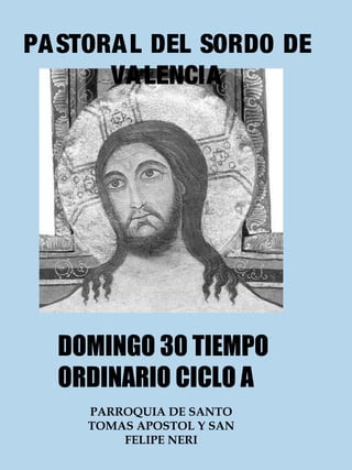 El documento presenta las lecturas bíblicas del domingo 30 del Tiempo Ordinario, Ciclo A. En la lectura del Éxodo, Dios ordena no oprimir al forastero, a las viudas o huérfanos y ayudar al pobre. La carta a los Tesalonicenses habla de cómo aceptaron a Dios y abandonaron los ídolos. En el Evangelio, Jesús dice que los dos mandamientos más importantes son amar a Dios y amar al prójimo.