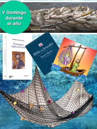 El documento presenta lecturas bíblicas de la vocación de Isaías y la llamada de los primeros discípulos. La primera lectura describe cómo Isaías se siente indigno ante la visión de Dios, pero es purificado por un ángel. Responde que está dispuesto a servir a Dios. La segunda lectura habla de la resurrección de Cristo. La tercera lectura narra cuando Jesús llama a Pedro, Santiago y Juan a ser pescadores de hombres después de una gran pesca milagrosa. El documento resume la vocación como un descubrimiento de la propia ins