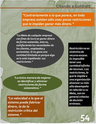 1) El documento describe la Teoría de las Restricciones (TOC), una metodología de gestión desarrollada por Eliyahu Goldratt que se enfoca en identificar y explotar las "restricciones" que limitan el rendimiento de una empresa. 2) TOC propone un proceso de cuatro pasos para gestionar una empresa que incluye identificar las restricciones, decidir cómo explotarlas, subordinar otros procesos a esa decisión, y elevar las restricciones. 3) El documento también brinda detalles sobre el origen