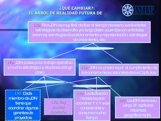El documento propone varios cambios para mejorar el funcionamiento de la organización ANEIAP. Sugieren asignar responsabilidades de manera diferente, mejorar la coordinación entre los capítulos y la junta directiva nacional, y desarrollar estrategias efectivas a largo plazo con participación de todos los miembros.