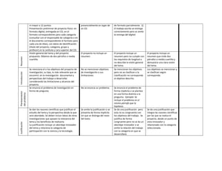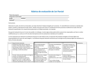 Este documento presenta una rúbrica de evaluación para el primer parcial de un proyecto de investigación. La rúbrica evalúa aspectos como la presentación, el formato, el resumen, la introducción, los antecedentes y la metodología propuesta en 3 niveles: 1) no cumple con los requisitos, 2) cumple parcialmente, 3) cumple completamente. También incluye instrucciones para los evaluadores y detalles sobre cómo utilizar la rúbrica.