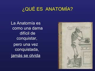 El documento proporciona una historia de la anatomía a través de los tiempos. Explica que la anatomía se ha estudiado desde la antigua Mesopotamia y Egipto, pero que fue en Grecia donde se desarrolló de forma más sistemática, con figuras como Hipócrates, Aristóteles y los anatomistas de Alejandría. Más tarde, en la Edad Media y el Renacimiento, anatomistas como Leonardo da Vinci y Vesalio avanzaron el conocimiento anatómico a través de disecciones y dibujos. El document