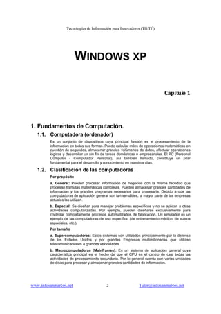 Este documento describe los fundamentos de la computación, incluyendo los componentes de hardware y software de un sistema de cómputo. Explica que el hardware incluye dispositivos de entrada, procesamiento, almacenamiento y salida de datos, mientras que el software incluye aplicaciones y sistemas operativos. Luego, se enfoca en los sistemas operativos, definiéndolos como software que administra los recursos del hardware y permite la ejecución de otros programas. Finalmente, clasifica los sistemas operativos en de texto e interfaz gráfica.