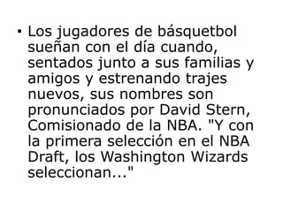 El documento habla sobre el proceso de selección de jugadores en el NBA Draft. Los jugadores sueñan con ser seleccionados y unirse a un equipo de la NBA. Los equipos evalúan a los jugadores a través de entrenamientos, exámenes médicos y de personalidad. Al elegir, los equipos consideran tanto sus necesidades actuales como el mejor jugador disponible. Generalmente, los jugadores con cuatro años de experiencia universitaria están mejor preparados para competir a nivel profesional.