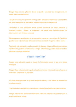 Este documento contiene información sobre herramientas de Google Docs como la creación, edición y compartición de documentos. También incluye definiciones de términos como repositorios, fuentes confiables e información efectiva, así como ejemplos de cada uno. El documento resume las lecciones y tareas asignadas por un profesor.