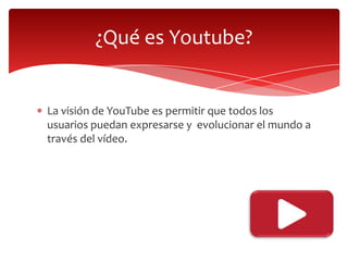 Este documento describe cómo funciona YouTube y cómo las personas pueden usarlo. Explica que YouTube permite a los usuarios expresarse y compartir videos. Detalla cómo las personas pueden buscar, ver y compartir videos en YouTube, así como crear una cuenta para subir sus propios videos y interactuar con otros usuarios. También especifica los formatos y tamaños de video aceptados por YouTube.