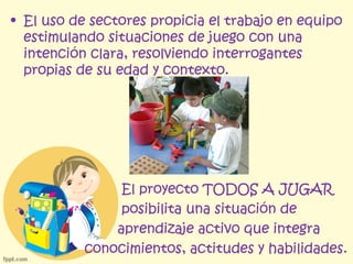 Este documento describe un proyecto llamado "TODOS A JUGAR" cuyos objetivos son desarrollar la autonomía e independencia de los niños, lograr que se socialicen con sus compañeros, y estimular el trabajo en equipo. El método utilizado se basa parcialmente en el método Montessori, enfocándose en áreas como vida práctica, lenguaje, matemáticas, ciencia y arte, con el fin de que los niños sean capaces de descubrir por sí mismos y construir su propio aprendizaje.