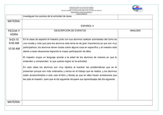 El documento describe las observaciones de un estudiante normalista sobre las clases que tomó en una telesecundaria durante dos días. Se detallan las actividades, dinámicas y comportamiento de los alumnos en cada una de las materias. En general, se observa poca participación y atención de los alumnos, quienes se distraen fácilmente y no siempre terminan sus tareas.