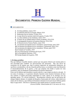 Este documento presenta información sobre la Primera Guerra Mundial, incluyendo documentos históricos, cartas y discursos de la época. Se describen las tensiones previas a la guerra entre las potencias europeas, la vida cotidiana de los soldados en las trincheras, la propaganda de guerra y los Catorce Puntos propuestos por el presidente Wilson para lograr la paz. Finalmente, se exponen las diferentes posturas de Lloyd George, Clemenceau y Wilson sobre las condiciones para la paz durante la conferencia de paz de París de 1919.