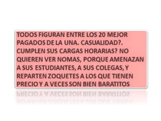 El documento describe varios problemas en la Facultad de Ciencias Médicas y el Hospital de Clínicas, incluyendo nepotismo, malversación de fondos, falta de suministros médicos y amenazas a estudiantes y médicos. Varios funcionarios están siendo investigados por desaparición de carne y otros insumos, así como por cobrar pagos de pacientes y quedarse con el dinero. Los estudiantes deben comprar sus propios suministros y hay escasez de equipos médicos. Se menciona la influencia negativa continua de
