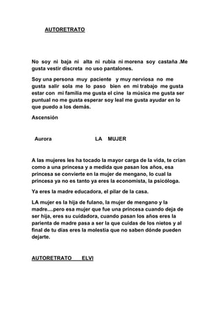 Este documento contiene varios autorretratos y descripciones personales de diferentes individuos. En general, las personas describen sus rasgos físicos como el color de pelo, piel y ojos, estatura y complexión. También comparten detalles sobre sus personalidades, incluyendo cualidades como la paciencia, puntualidad y lealtad. Algunos describen sus aficiones como la música, cine, deporte y pasatiempos como la lectura.