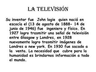Este documento resume cinco importantes inventos tecnológicos: la televisión inventada por John Logie Baird en los años 1920, el ferrocarril inventado por George Stephenson en 1814, Internet inventado por Tim Berners-Lee en los años 1970, el helicóptero inventado por Leonardo da Vinci en 1493 y el automóvil inventado por Etienne Lenoir en 1863. Todos estos inventos revolucionaron la forma en que las personas se comunican y se transportan y ayudaron a satisfacer necesidades humanas como la movilidad, la información y el transporte a larg