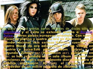 Este documento proporciona información sobre la banda de pop rock alemana Tokio Hotel. Se forma en 2001 en Alemania y está compuesta por Bill Kaulitz, Tom Kaulitz, Georg Listing y Gustav Schäfer. Han tenido gran éxito comercial en Alemania y otros países europeos. Sus álbumes Schrei, Zimmer 483 y Humanoid alcanzaron el número uno en las listas de éxitos alemanas.